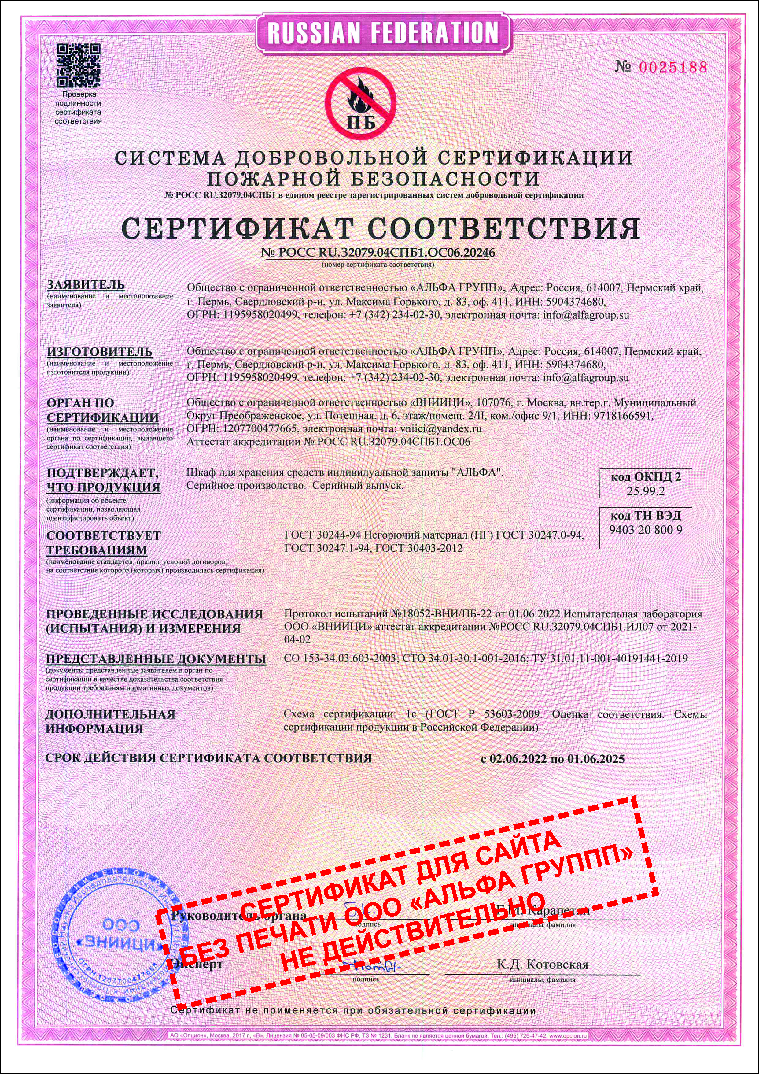 Сертификат ПОЖАРНОЙ безопасности на шкаф АЛЬФА